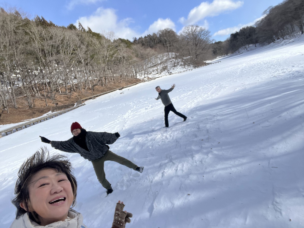 私と東京育ちのゆきちゃんが、雪と氷の道に足を取られて「キャーキャー」言いながらヨチヨチ歩いている横で……
